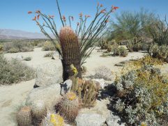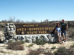 Wir sind gestern deutlich vor der Zeit in San Diego gelandet (ca. 45 Minuten) und waren zeitig beim Dollar Mietwagenschalter. Dort ging auch alles sehr schnell und wir konnten unseren Wagen aussuchen. Irgendwie war das ganze Parkhaus aber fast leer. In der Dollar/Thrifty Reihe für Midsize SUV standen drei Fahrzeuge, von denen einer kein SUV war. Die anderen Beiden waren Jeep’s. Ein blauer Compass und ein weißer Patriot. Letzterer gefiel uns besser und so haben wir unsere Sachen eingeladen. Dann haben wir ein Hertz Navi gefunden und waren etwas verwirrt. Aber an der Ausfahrt hat man uns versichert, wir bräuchten uns keine Gedanken zu machen. Der vierte Wagen hat dann endlich einen Namen bekommen. Getreu der Tradition des letzten Jahres heißt dieses fast brandneue Schmuckstück nun Snowball II. Okay, Simpsons Fans wissen natürlich, dass in der Serie nur Snowball I weiß war und die nachfolgenden Katzen Snowball II und III schwarz. Wir werden versuchen auf der nächsten Reise ein schwarzes Auto zu bekommen. Das Days Inn war ebenfalls schnell gefunden und mit der Reservierung hat auch alles geklappt. Wir sind dann etwas länger aufgeblieben (waren auch noch bei Denny’s essen) und haben auch heute länger geschlafen. Bei super gutem Wetter ging es dann Richtung Osten. Erster Stopp war das Viejas Outlet Center, wo wir ein paar Kleinigkeiten gekauft haben. Dann ging es in den Anza-Borrego Desert State Park. Wenn man Steffi glauben darf, dann ist es der beste State Park – bis jetzt. Am Park Schild haben wir für den obligatorischen Fotostopp gehalten und dann der Schock – Der Sheriff hat uns gesehen, gedreht und steht plötzlich hinter uns. Oh je, hier darf man bestimmt nicht halten. Aber dann die Überraschung – wenn wir aussteigen, dann macht er ein paar Fotos von uns zusammen mit dem Schild. Wir sind immer wieder begeistert. Der State Park selber ist wirklich super toll mit seinen ganzen Kakteen, allerdings bekommt man hier schon Mitte März die große Hitze und Trockenheit zu spüren. Morgen werden wir uns noch weitere Teile von Anza-Borrego ansehen, aber für heute reicht es erst einmal. Im Apple Tree Inn hatte man keine Reservierung vorliegen, aber zum Glück noch ein paar freie Zimmer. Jetzt gehen wir noch zu Jeremy on the Hill und morgen dann wieder zeitig los.