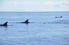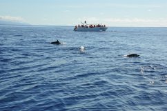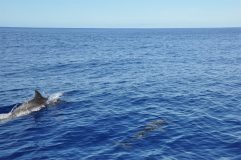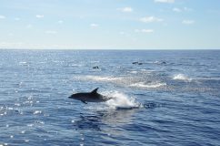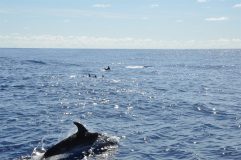 Hatte ich vor zwei Tagen doch wirklich geschrieben: Das Wetter sei gut, aber nicht so heiß. Forget it! Es ist super gut und seit gestern richtig heiß. Heute Morgen waren wir gut in der Zeit und pünktlich am Treffpunkt. Viele Menschen, aber zum Glück verteilt auf mehrere Boote. Wir waren auf einem Semi-Rigid Boot (Google mich). Nur wenig Plätze und richtig schnell. Ihr seht, man muss also einen Kompromiss eingehen. Aber so ist es ja meistens. Alles auf der Tour war wie beschrieben: 30 Minuten Einweisung, Schwimmweste tragen und dann 2,5 Stunden raus auf den Atlantik. Wale haben wir keine gesehen, aber dafür Delfine…und wie! Die beiden ersten Gruppen waren noch etwas zurückhaltend, aber die letzte Gruppe war so richtig an den Wellen unseres Bootes interessiert. Was für Akrobaten, genau das wollten wir sehen. Der Ausflug war so gut und erfolgreich, für die beiden Nächsten auf Pico haben wir absolut keinen Druck mehr. Alles was jetzt kommt ist Bonus. Auf unserem Weg zurück zum Hotel haben wir in einem Straßencafe noch einen Galão getrunken und sind nach einer kurzen Pause gleich weiter zum Rocha da Relva. Im Rother Wanderführer die Tour 10, angepriesen als kurze und leichte Wanderung. Wieder 150 Höhenmeter zu überwinden. Erst hinab und dann wieder hinauf. Das Ganze gefühlt noch steiler als gestern. Zwei anstrengende Stunden später saßen wir in unserer Eisdiele. Ich hatte doch schon erwähnt, dass wir eine super gute Eisdiele direkt neben unserem Hotel haben! Heute Abend waren wir noch im Shopping Center Parque Atlantico und haben im Food Court gegessen. Dabei haben wir zwei Gerichte probiert und geteilt. Es war echt lecker. Jetzt geht ein weiterer toller Tag zu Ende und wir fragen uns, was da eigentlich noch kommt?