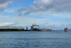 Steffi war die halbe Nacht wach und musste dann heute Morgen auf die Krankenstation. Jetzt ist sie in Quarantäne und muss mindestens die nächsten 24 Stunden auf unserer Kabine bleiben. Im Hospital war es wohl richtig voll, es scheint also kein Einzelfall zu sein. Inzwischen wurden auch strengere Maßnahmen getroffen. Zu den Tabletten gibt es jetzt auch Elektrolyte in Pulverform, einen detaillierten Fragebogen zum Krankheitsverlauf und man muss am nächsten Tag auf jeden Fall noch einmal zum Doktor. Ich bin nach Steffi’s Rückkehr gleich auf Deck 8 zum Selection Restaurant gegangen, denn eigentlich hätten wir heute noch einen Kochkurs gemacht. Den musste ich natürlich absagen. Da ich selber letzte Woche einen ganzen Tag isoliert gewesen bin, weiß ich, wie langweilig es sein kann. Also war ich nur 3-4 mal kurz draußen, um etwas zu essen. Den Rest der Zeit war ich bei ihr auf der Kabine. Draußen war es zudem den ganzen Tag bewölkt und seit einiger Zeit gießt es in Strömen. Nicht wirklich schön. Ich war mir auch nicht ganz sicher im Bezug auf die Reise, aber es sind dann doch die Umstände, die das Reisegefühl mindern. Erst wieder die unzähligen Moskitostiche und dann noch gesundheitlich angeschlagen, das macht einem doch zu schaffen. Jetzt versuchen wir die letzten Tage noch ohne größeren Schaden zu überstehen.