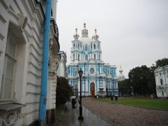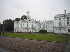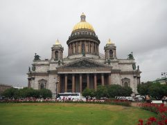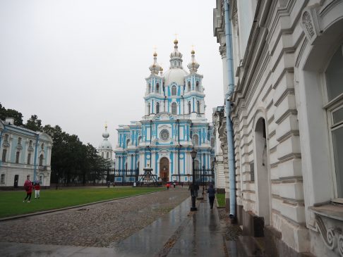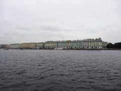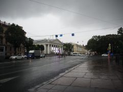 Gestern saßen wir beim Abendessen, als wir den Ladogasee erreicht haben. Da es sehr windig gewesen ist, hat auch gleich der Seegang zugenommen und die Alexander Borodin fing zum ersten Mal so richtig an zu schaukeln. Vom See selber haben wir leider nichts gesehen, denn da war es schon dunkel. So saßen wir gestern Abend beim Abendessen mit dem Kapitän. Die Kleidungsempfehlung war sportlich elegant. Wir hatten natürlich Klamotten für diesen Abend eingepackt. Da wir heute Abend aber noch ins Ballett gehen, haben wir uns die besten Kleidungsstücke für dieses Ereignis aufgespart. Das Abendessen war sehr gut, wie immer eigentlich, aber nichts außergewöhnliches. Auf dem nett angerichteten Vorspeisenteller gab es auch wieder Kaviar, aber für meinen Geschmack viel zu wenig. Ich hatte eigentlich erwartet, dass wir hier an Bord reichlich mit Kaviar versorgt werden würden. Das ist für mich die einzige Enttäuschung dieser Reise. Er scheint aber auch hier schon zu selten und zu teuer zu sein. Zum Schluss des Abends kam noch einmal die ganzen Küchenmannschaft und hat Eistorten präsentiert. Es war eine sehr unruhige Nacht. Auf Grund des Windes hatte man vorsorglich die Fenster bei uns auf dem Hauptdeck verriegelt. Man musste also mit dem Sauerstoff in der Kabine auskommen. Dann hat das Schiff die ganze Zeit auf dem Ladogasee geschaukelt und im Einklang dazu, die Wandpaneele in unserer Kabine. Es war zum Durchdrehen. Wir sind schon eine Stunde früher in Sankt Petersburg angekommen und der Himmel hing da schon voller dunkler Wolken. Am heutigen Vormittag haben wir schon die Stadtrundfahrt gemacht. Schöne Architektur und interessante Gebäude. Aber auch die Erkenntnis, dass die Stadt ein Touristenproblem hat. Hier im Flusshafen liegen mehr als 10 Schiffe. Dazu kommen noch die Kreuzfahrtschiffe, die auf der anderen Seite der Stadt anlegen. Busse ohne Ende, ein gruseliges Gewusel und dann auch noch der Regen. Beim letzten Stopp hat es uns draußen voll erwischt. Es kam plötzlich so viel Wasser herunter, dass man binnen 30 Sekunden komplett nass gewesen ist. Jetzt trocknen wir und wärmen uns etwas auf. Hoffentlich kommen wir trocken am Abend ins Theater.