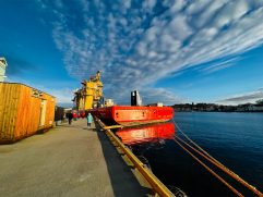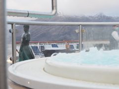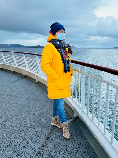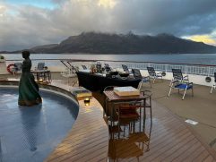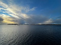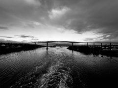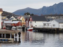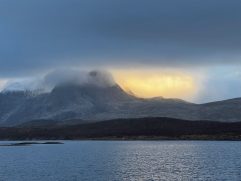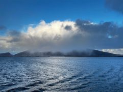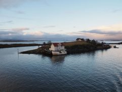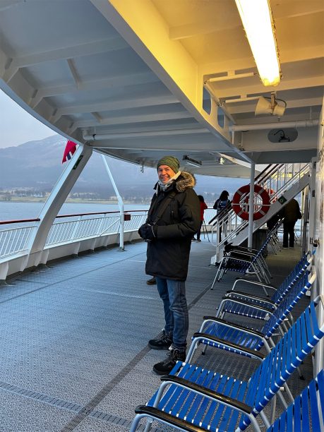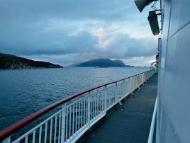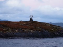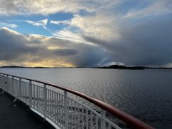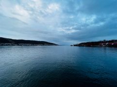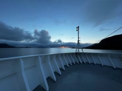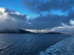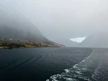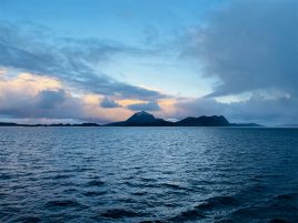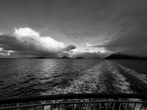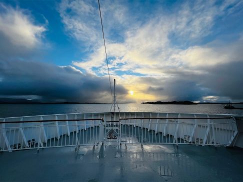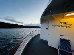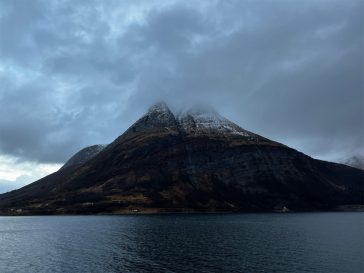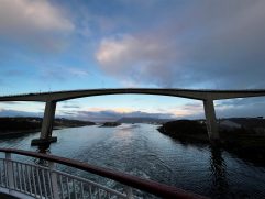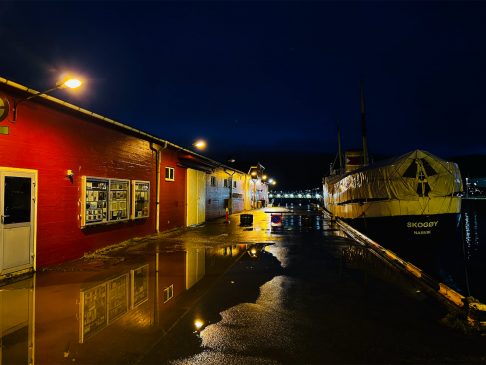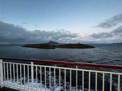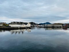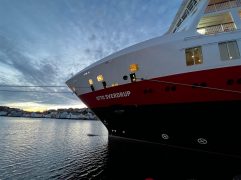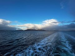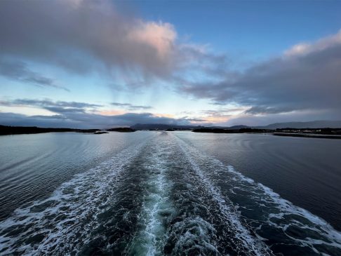 [10:49] Es gab heute Vormittag schon so viel zu tun, da komme ich erst jetzt zum ersten Tageseintrag. Fangen wir mit dem Schiffsreport an: Gestern haben wir kurz hinter Narvik zur MS Maud aufgeholt. Die ist jedoch inzwischen in einen Fjord nach Osten abgebogen. Heute morgen, als wir gegen 8:30 Uhr den Polarkreis passiert haben, war die MS Nordkapp direkt hinter uns. Da sie ein Schiff auf der Postschiffroute ist, hat sie uns auf Grund ihres Zeitplans zwischenzeitlich überholt. Ihr nächstes Ziel war Nesna, welches sie nun bereits wieder verlassen hat. Jetzt ist sie also wieder hinter uns. Aktuell findet auf Deck 7 die Polarkreistaufe statt. Wir haben mal kurz geschaut und sind dann wieder gegangen. Wurde schnell zu voll und wir haben unsere Taufe ja bereits vor mehr als 10 Jahren auf der MS Kong Harald erhalten. Wir sind eben der Meinung, dass man es auch nur einmal machen sollte. Was wir aber gerade gemacht haben, wir haben zwei unserer Eventim Veranstaltergutscheine eingelöst und freuen uns auf Gentleman im kommenden Mai in Hamburg … hoffentlich. Etwas ärgerlich ist, dass wir wegen der bevorstehenden Expeditionsreise unsere Alanis Morissette Tickets zurückgegeben haben und sie nun kurzfristig doch noch ihre Tour verschoben hat. Was soll’s, auch die Gutscheine müssen ja irgendwann wieder eingelöst werden. Aber zurück zur Reise. Wir wärmen uns jetzt mit heißem Tee, Kakao hatten wir bereits, und gehen dann wieder an Deck die Landschaft genießen. [13:55] Das Wetter wechselt heute im Viertelstundentakt. Zum Glück gibt es immer Stellen an Deck, wo man Schutz vor dem Regen findet. Aber es lohnt sich draußen zu bleiben. Wir haben bereits drei Seeadler in Aktion gesehen. Die MS Nordkapp hatte auch wieder zu uns aufgeschlossen. Das Expeditions Teams hat norwegische Flaggen verteilt. Nette Idee, sollten wir ordentlich Rabatz machen, wenn sie an uns vorbei fahren. Ist aber leider nix geworden, denn sie haben kampflos aufgegeben und sind nach Sandnessjøen abgebogen. Inzwischen holen sie wieder auf, verlieren aber in Brønnøysund Zeit auf uns. So wird es dann bis Bergen weiter gehen. Wir waren gerade zum Mittagessen im Fredheim. Die haben ihre Karte wieder leicht verändert. So gab es als Vorspeise Lachs- und Schweinefiletspieße. Dann hatte ich Quesadillas mit Lammwurst und Steffi nach einmal den Nansen Burger. Zum Nachtisch noch eine große Portion Pancakes mit Trollcreme. War richtig lecker. Gleich geht es noch einmal raus an Deck, bevor die Dunkelheit uns wieder umschließt. [15:47] Überraschung, denn wir sind direkt an Brønnøysund vorbei gefahren und haben kurze Zeit später auch noch einmal den Torghatten umrundet. So konnten wir ihn doch noch bei abnehmendem Tageslicht kurz vollständig sehen. Vielleicht sind auch ein paar gute Aufnahmen gelungen. Jetzt haben wir es uns in der Kabine gemütlich gemacht und relaxen mal eine Zeit. Viel steht heute nicht mehr auf dem Programm. Abendessen und ein letztes Mal an Deck Ausschau nach Polarlichtern halten (wir geben nicht auf). Da wir auf dieser Reise aber nicht so sehr von Erfolg verwöhnt worden sind, wird die nächste Tour nach Skandinavien bestimmt nicht lange auf sich warten lassen. Wir werden dann mal den Monat März als Reisezeitraum einplanen. Aber nicht nächsten März, das wäre noch etwas zu früh. [20:51] Kommen gerade zurück vom Abendessen. Drei von vier Gängen waren ganz gut. Bei meiner Wahl der vegetarischen Hauptspeise habe ich allerdings etwas daneben gegriffen. Der Kartoffelpuffer mit Rote Beete sah zwar gut aus, hat aber keinen wirklichen Geschmack gehabt. Dafür hat das Eis am Ende entschädigt. Gerade als wir beim Essen saßen hat uns die MS Kong Harald, heute als nordgehende Route, an Backbord passiert. Die MS Nordkapp haben wir, wie vermutet, inzwischen weit hinter uns gelassen. Morgen früh erreichen wir Kristiansund und wir haben dann sogar noch 2-3 Stunden Zeit für einen Landgang, bevor wir mit dem Bus zur Atlantikstraße starten. Eingesammelt werden wir dann wieder in Molde. So, jetzt noch einmal raus an Deck die Lage checken und dann Bettruhe. Morgen wird es wieder früh und anstrengend.