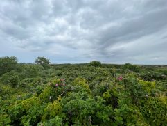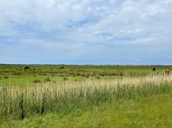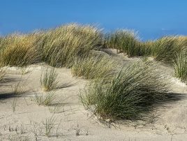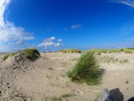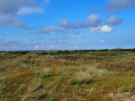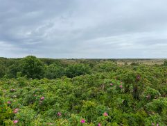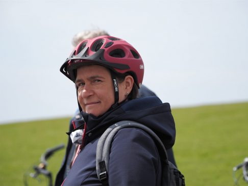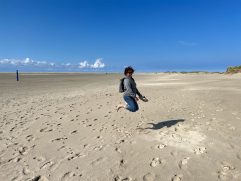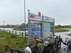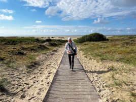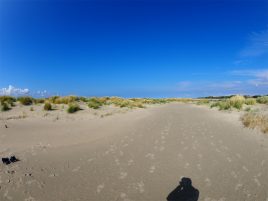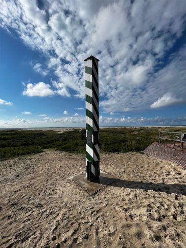 Fünf unterschiedliche Wetter Apps und jede hat für heute etwas anderes angezeigt. Meine hatte leider recht, denn sie hat Regen vorhergesagt. Wir sind zur gewohnten Zeit am Hotel gestartet, haben uns zunächst das vermeintlich älteste Haus der Insel angesehen und sind durch die Dünen bis zum Flugplatz. Dort angekommen kam der große Regen. Bedauerlicherweise hielt er fast zwei Stunden an und wir mussten ja irgendwann weiter zum Café Ostland. Also sind wir alle ganz schön nass geworden. Aber unsere Klamotten sind echt gut, denn sie waren auch schnell wieder einigermaßen trocken. Dort angekommen haben wir zu Mittag gegessen. Eigentlich wollten wir nur eine Kleinigkeit essen, haben dann aber doch beide Labskaus bestellt. Es war eine riesige Portion mit Matjes und Spiegelei. Ich habe es kaum geschafft und Steffi erst recht nicht. Dann ging es weiter zur Aussichtsdüne und so langsam begann die Sonne den Regen zu verdrängen. Die Rückfahrt führte uns wieder am Deich entlang, wo wir am Ende eine kleine Herde Schafe entdeckt haben. Durch unseren Fotostopp haben wir glatt die Gruppe verloren und sind dann alleine zurück gefahren. Zurück am Hotel haben wir uns etwas frisch gemacht. Nach den gut 31 Kilometern gestern, sind wir heute auch noch einmal 18 Kilometer gefahren. Am späten Nachmittag sind wir dann ein ganzes Stück barfuß am Strand entlang gelaufen. Wieder an der Promenade hatten wir im Geeske & der swarte Roelf wieder ein leckeres Bier getrunken. Leider war die Currywurst ausverkauft, so ist es heute nur bei einem Bier geblieben. Vom Hunger getrieben sind wir in die Pizzeria am Leuchtturm gegangen und hatten zwei richtig gute Pizzen. Jetzt faulenzen wir etwas und freuen uns auf den morgigen Tag, Das Wetter soll ganz gut werden und auf dem Programm stehen Teezeremonie und Aquarium. Wird wieder ein langer Tag und am Ende müssen wir schon wieder packen.