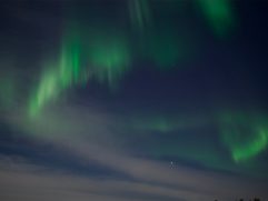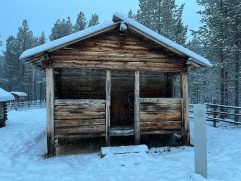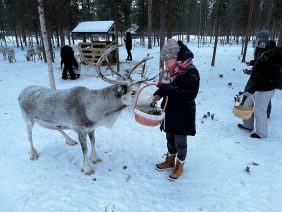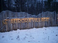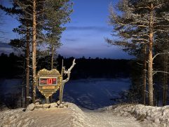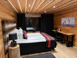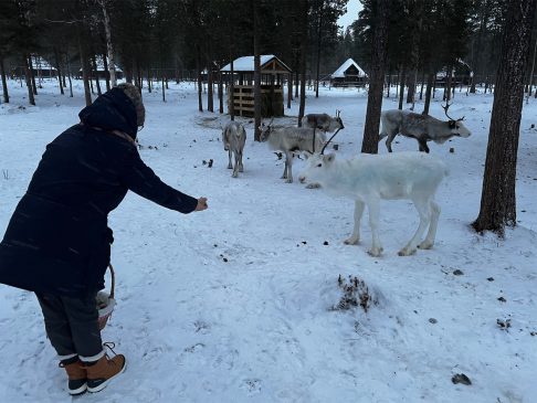 Das mit den Rentieren war ein Riesenspaß. Der Glühwein auch und das Abendessen war auch wieder richtig gut. Nur Polarlichter gab es keine mehr. Wir haben dann auch irgendwann geschlafen und unser Tag war damit vorbei. Wie gesagt, wir haben schon damit begonnen, die nächsten 25 und mehr Jahre gemeinsam zu verbringen. Nach unserem heutigen Frühstück haben wir das Aurora Village verlassen. Der Schneefall, der gestern Vormittag begonnen hatte, hielt noch immer an. Entsprechend lange hat es gedauert den Wagen frei zu räumen. Für uns ging es nach Inari. Dort haben wir das Sami Museum besucht, zwei Souvenir Shops durchkämmt, uns eine leckere Pizza geteilt und am Ende noch schicke Souvenir Socken aus Merinowolle gekauft. Dann mussten wir erst zurück nach Ivalo und anschließend links ab zum Nangu Wilderness Hotel. Da es ab 14:30 Uhr schon gut dunkel wird, die Straßen nicht beleuchtet sind und es noch immer schneite war es spannend, wenn auch gleich anstrengend, zu fahren. Unterwegs haben wir sogar noch vier wilde Rentiere gesehen. Jetzt sind wir im Wilderness Hotel und bleiben drei Nächte in unserem Superior Room 205. Draußen ist genug Schnee und wir warten mal ab, was uns hier so erwartet.