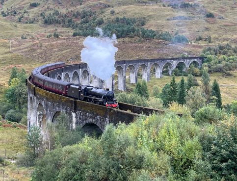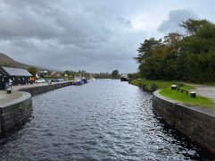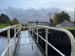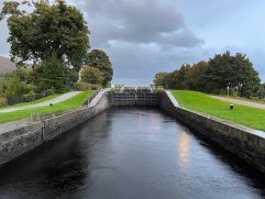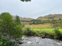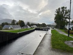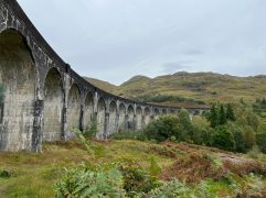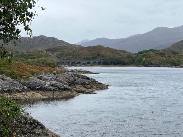 Nach einer fast perfekten Nacht konnten wir in aller Ruhe in den Tag starten. Nach einem ersten Kaffee und der Dusche sind wir Richtung Norden gefahren. Erst aber nur einige Kilometer. Dann haben wir bei Poppies für unser Frühstück gestoppt. Es ist ein Gartencenter/Souvenirladen/Café und es war richtig gut. Mit zwei Tagen Verspätung gab es endlich die lang ersehnten Egg’s Benedict und Steffi hatte Avocado Smash auf Toast. Beide mit Lachs aus der Region und nach der Hälfte wurde getauscht. Dazu gab es wie immer leckeren schwarzen Tee. Anschließend sind wir bis Fort William gefahren. Dort gab es aber nur schnell Kaffee (Maple Hazel Latte), Hot Chocolate und Banana Bread. Schon ging es weiter bis zum Glenfinnan Viaduct. Wem das jetzt auf Anhieb nicht sagt: Es ist ein historisches Bauwerk, über dem heute noch Züge fahren und es spielt auch zufälligerweise eine Rolle in einem der Harry Potter Filme. Als wir den Wagen geparkt hatten und zum Viaduct gelaufen sind, war es zum Glück noch trocken. Wir hatten sogar gleich noch zweimal Glück, denn am Aussichtspunkt angekommen mussten wir auch nicht lange auf zwei Züge warten. Und um den Bogen noch zu überspannen, war der zweite Zug die historische Dampfeisenbahn (der Hogwarts Express). Das sah schon richtig gut aus. Weiter ging es für uns nach Mallaig. Dort haben wir vor neun Jahren mit der Fähre zur Isle of Skye übergesetzt. Damals bei strahlendem Sonnenschein. Heute konnten wir direkt am Parkplatz die Regenhosen überziehen. Wir hatten Steffi handgefertigte Ohrstecker gekauft und sind dann in The Tea Garden gegangen. Sehr beliebt, sehr voll, sehr gut. Ich hatte das Coronation Chicken Sandwich und Steffi mit Cullen Skink einen traditionellen Fischeintopf. Dann haben wir uns wieder auf den Rückweg gemacht, sind aber in Lochailort abgebogen auf die Nebenstraße. Der Plan war einmal um Loch Shiel herum zufahren und die Fähre nach Corran zu nehmen. Auch die Strecke sind wir damals schon gefahren, denn unterwegs kommt man am Mingarry Park Hotel vorbei. Dort sind wir 2014 für eine Nacht gewesen und konnten uns heute auch noch an einiges erinnern. Kurze später mussten wir allerdings umdrehen und die ganze Strecke wieder zurückfahren. Grund war, dass die Corran Ferry aktuell nicht fährt bzw. keine Fahrzeuge transportiert. Also mussten wir doch wieder den Weg über Fort William nehmen. Aber so konnten wir uns noch die Schleusenkammern am Caledonian Canal (Neptun’s Staircase) ansehen und in Fort William zu Abend essen. In der Black Isle Bar gab es alkoholfreien IPA und leckere Pizza. Dazu kamen wir noch mit zwei Schwarzwäldern ins Gespräch, an deren Tisch wir uns gesetzt hatten. Die letzte Stunde Fahrt durch Regen und Dunkelheit war dann noch lang, aber auch das haben wir geschafft. Jetzt genießen wir unseren letzten Abend in Oban und werden sicherlich gleich wieder gut schlafen. Morgen geht es zum Loch Lomond.