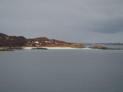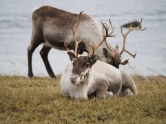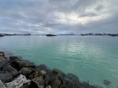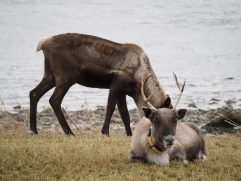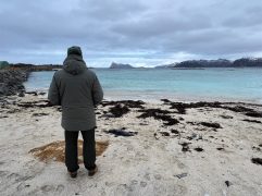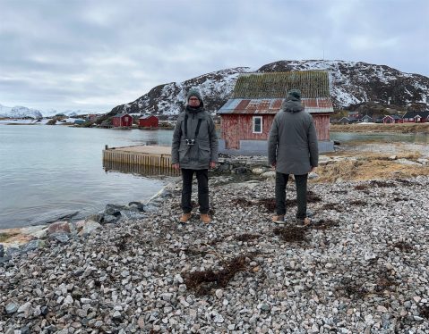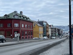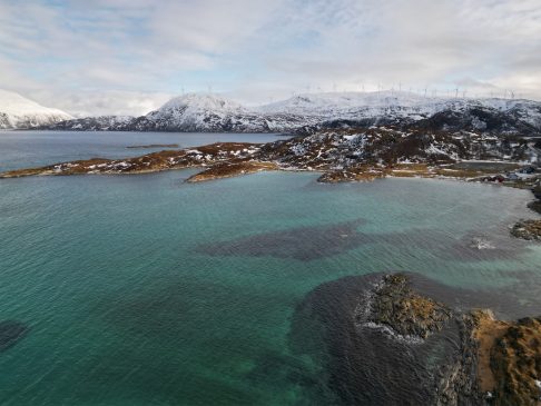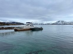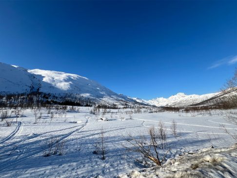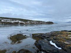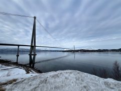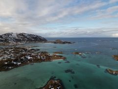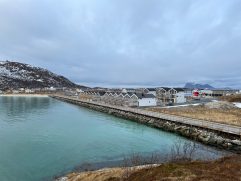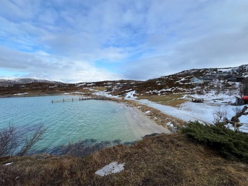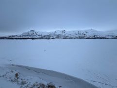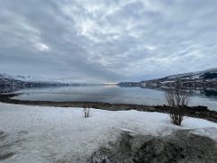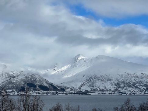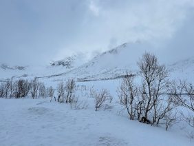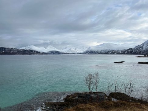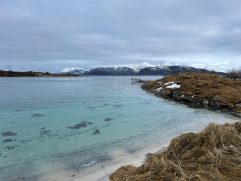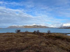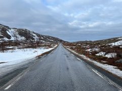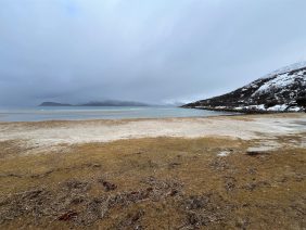 Das Restaurant war gestern Abend relativ voll, aber das Essen hat es rausgerissen. Auch wenn wir etwas länger auf die Vorspeise warten mussten, haben Fischsuppe sowie Lamm und Rentier super gut geschmeckt. Geschlafen haben wir auch ganz gut, in einem Rutsch bis die innere Uhr fünf gesagt hat. Das Frühstück hatte leider kleine Schwächen. Die Spiegeleier glitten über eine Schicht aus Öl und das Rührei sah aus wie Eisuppe. Der Rest war wie sonst überall auch. Also kein Highlight im Vergleich zum Abendessen. Wir haben uns dann bei echt gruseligem Wetter auf den Weg Richtung Tromsø gemacht. Dabei ging es darum, die Strecke zum Flughafen für morgen früh zu begutachten und um nach Rentieren Ausschau zu halten. Letztere haben wir schon gleich nach den ersten paar Kurven gesehen und was die Strecke angeht, ist diese frei und gut in einer Stunde machbar. Im Hochland haben wir gestoppt und sind durch den Schnee gestapft. Steffi wollte noch gerne ihre selbst gefärbte Wolle im Schnee fotografieren. Für Instagram ganz gut geworden. Wir sind bis Storelva gefahren, das liegt gegenüber vom Tromsø Airport, und haben uns dann wieder auf den Rückweg gemacht. Zurück auf Sommarøy wurde das Wetter auch noch einmal besser, so dass wir noch eine Menge Fotos und ein paar Aufnahmen mit der Drohne gemacht haben. Geladen haben wir den Wagen am Havfra Kro, drinnen gab es Tee und Kuchen, gleich bis auf 97%. Somit sollten wir bei der Abgabe irgendwo zwischen 70 – 80% liegen. Was gar nicht ging, war der Bereich vor den Ladesäulen. Dort ist man regelrecht im Match versunken. So etwas finde ich ein Ärgernis. Tisch für heute Abend ist auch wieder bestellt. Wir genießen nun einen Tee in der Lobby und wenn wir dabei rausschauen, dann sagt eine Hälfte am Himmel Aurora möglich und die andere auf keinen Fall.