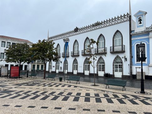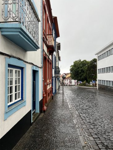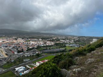 Das mit dem Abendessen gestern war doch schwieriger, als gedacht In Biscoitos gab es zu der Uhrzeit nichts vernünftiges. Also mussten wir wieder einmal über die ganze Insel fahren. Aber es hat sich gelohnt. Wir hatten gutes Essen und danach sensationelles Eis. Chocolate with Cheese, das kannst du dir nicht selber ausdenken. Wieder zurück haben wir die Sachen schon mal etwas vorbereitet und waren dann früh schlafen. Das Schwimmen hat uns echt geschafft. Die Nacht war gut und entspannt und unser Frühstück wieder super. Heute aber mal drinnen, denn das Wetter war den ganzen Tag nicht wirklich gut. Dann hieß es Gepäck mit dem Lift nach unten, alles verstauen und Abschied nehmen. Wir hatten eine wirklich gute Zeit. Für uns ging es dann mal wieder einmal über die Insel von Nord zunächst nach Süd. Die Hauptstadt Angra do Heroismo stand heute auf unserem Programm. Gleich zu Beginn waren wir kurz bei Sport Zone. Nach dem Fiasko mit meinen Nike Turnschuhen zu Hause (zweimal zurückgegeben), wollte ich mir hier schnell noch ein paar neue kaufen hat 5 Minuten gedauert. Dann sind wir zum großen Parkplatz an der Arena gefahren. Wir waren die einzigen, die dort geparkt haben. Nach kurzer Zeit hieß es dann Regenjacke an und los. 10 Minuten später waren wir beide klatschnass. Also wieder das Auto holen und etwas dichter an die Altstadt. Auch dort haben wir schnell einen Parkplatz gefunden und nach weiteren 20 Minuten Wartezeit bei der Regen vorbei. Wir sind dann in aller Ruhe durch die Gassengeschlendert, hatten lecker Alcatra de Carne zum Mittag und haben uns zum Nachtisch noch zwei Dona Amelia gekauft. Dann ging es langsam entlang der Küste bis Praia da Vitória, wo wir die nächsten zwei Nächte im Atlantida Mar sind.