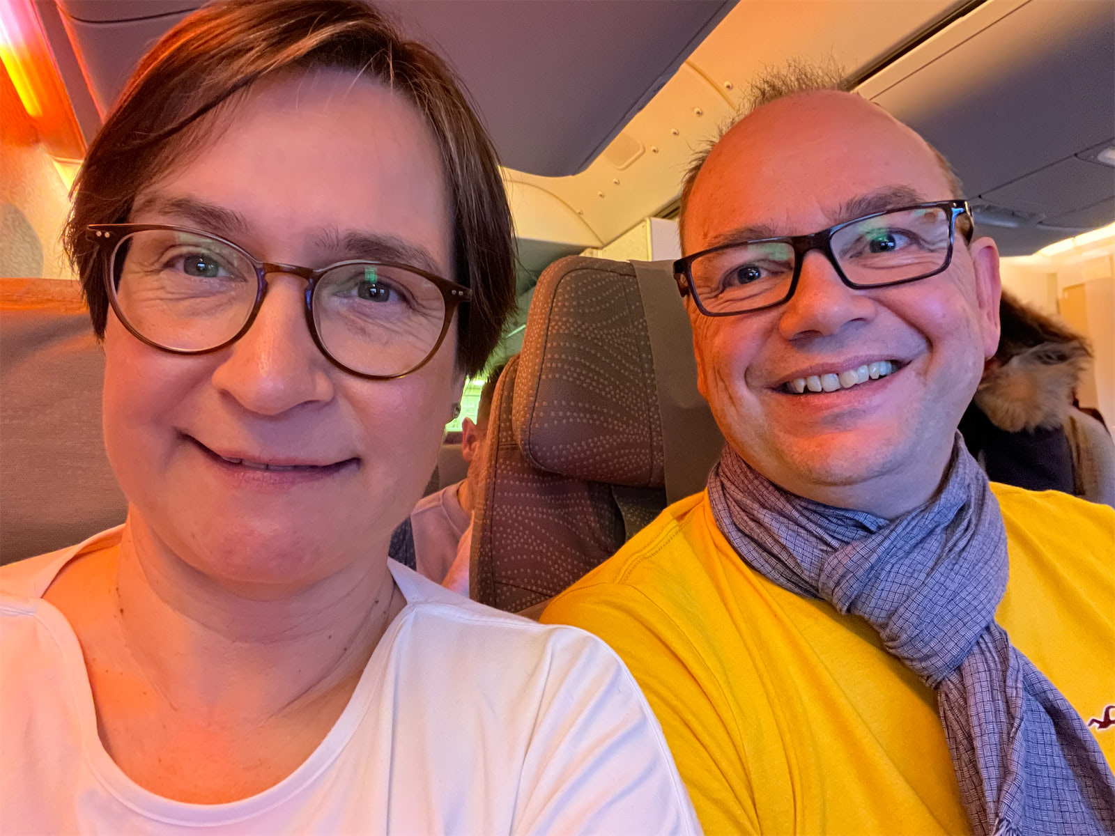 Am Ende ging es dann doch sehr schnell. Haben wir vor kurzem noch in Wochen gedacht, waren es plötzlich nur noch Tage und heute, heute ging es los. Wir haben noch gearbeitet, denn fünf Wochen Urlaub sind schon richtig lang und da kommt es auf jeden Tag an. Gegen 13:30 Uhr habe ich Steffi von der Arbeit abgeholt. Wir haben noch etwas gegessen, den Rest gepackt, zu Hause klar Schiff gemacht und haben dann um 16:30 Uhr den Bus zum Bahnhof genommen. Bis Hamburg hat alles wunderbar geklappt. Am Hauptbahnhof hatte die S-Bahn etwas Verspätung, aber auch das war kein Problem. Am Flughafen angekommen ging es direkt in Terminal 1 zum Emirates Check-In. Die Schlange war relativ lang, aber wir konnten rechts vorbei, weil wir schon online eingecheckt hatten. Es hat etwas gedauert, weil wir für die Drohne im Koffer noch eine Bescheinigung ausfüllen mussten und der Koffer mit der Drohne anschließend noch zum Sperrgepäck gebracht werden durfte. Außerdem war mein Handgepäck etwas zu schwer. Haben wir kurzerhand etwas in Steffis Rucksack umgepackt. Sicherheitskontrolle ging dann wieder erwartend superschnell. So ewig lange warten mussten wir dann auch nicht mehr und wir konnten als erste Gäste der Economy einsteigen. Das war oder ist das einzige Manko dieser Reise. Auf der Strecke Hamburg Dubai wird keine Premium Economy Class angeboten. Also ging es mal wieder etwas weiter nach hinten ins Flugzeug, um genau zu sein, ganz ans Ende. Dort hatten wir uns bei der Buchung einen Zweiersitz reserviert. Gegen Aufpreis versteht sich. Gestartet sind wir fast pünktlich und der Flieger war auch gut voll. Beim Service wurden wir als letzte bedient. Somit waren schon 2 Stunden vorbei, ehe wir schlafen konnten. Das das Essen war ganz gut und auch das mit dem Schlafen hat auf Anhieb geklappt. Wir hatten beide das Rindfleisch und einen Rotwein dazu. Wie gesagt, kurz danach war der Tag zu Ende und wir hatten die Augen zu.